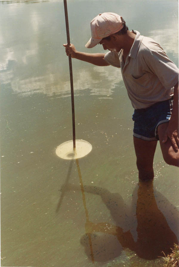 · 检查池塘水体(由浮游植物数量控制) 的透明度,可使用赛克盘(图78)定期进行测量。