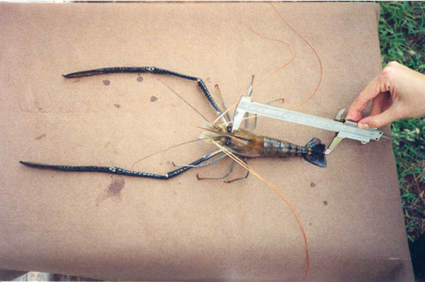 图81 正在以“科学”的方式对来自巴西圣保罗州立大学水产养殖中心的大型蓝螯罗氏沼虾的雄性亲虾进行测量(从眼眶后部到尾节顶端)