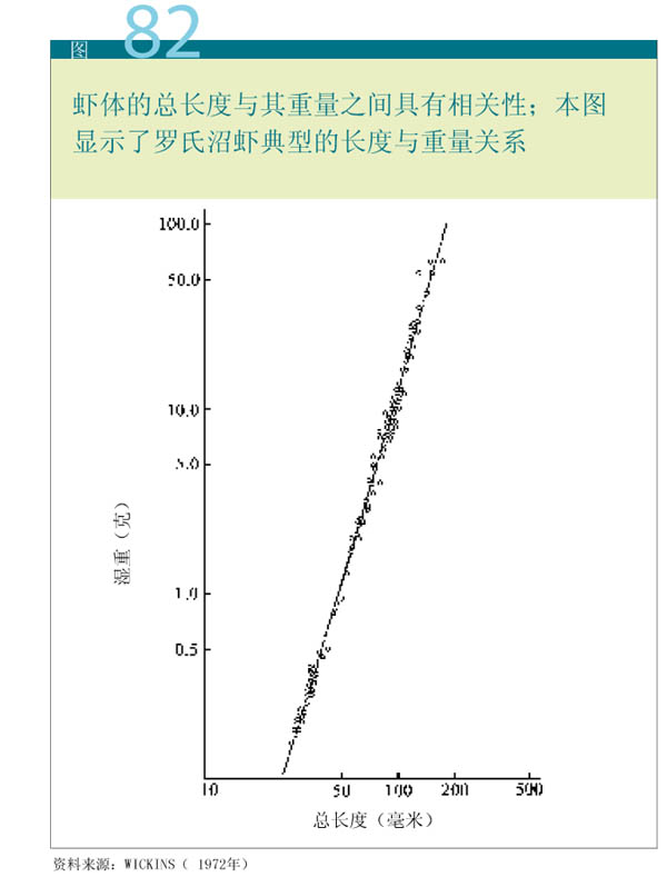 应当通过重量或总长度,定期对生长率进行测量。对从眼眶到尾节顶端 (图81)长度的测量是最可靠的方法(因为一些虾的额角由于损伤而变短),但是在养殖实践中,通常用尺子来测量从额角顶端到尾节顶端的总长度。图82显示了淡水虾不分性别种群的总长度和活重之间的关系。雄虾的重量略高于同等长度的雌虾,但不明显。图3显示了区分小虾(幼虾)性别的方法。本手册前面部分还对较大雌虾和不同雄性形态型之间的区别进行了论述。