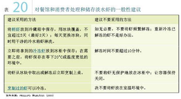 预计在3天之内不会售出的虾应当立即冷冻。冷冻工作应当在捕捞后进行,而不是当虾已被置于冰中数日之后才做。冷冻去头虾具有比全虾更长的货架寿命。如果冷冻淡水全虾在冷冻后置于-20C以上环境保存或解冻后再次冷冻,它们将变的“糟软”。建议将准备长期保存的虾放在-30至-35C的环境中。去头虾在冰块中可以存放一年以上(尽管建议的最长期限是6个月),而且仍能保持很好的质量。包冰衣和真空包装可以大大延长冷冻虾的有效保存寿命。虽然真空包装需要小型渔民所没有的精细加工设施,包冰衣却相当简单:用一层非常薄的糖浆和水的混合物来防止氧化。如果销售的是冷冻虾,不论是去头虾还是全虾,理想的是在三个月内将它们售出。倘若养殖场与市场需求保持协调(需要产品的时间、地点和数量要求),那么及时出售是可以做到的。良好的记录工作将有助于根据过去的经验,发展有效的养殖场管理系统。如果将虾出售给餐馆,或许会发现向他们提供有关如何保证最佳消费质量的建议是有益的(表20)。