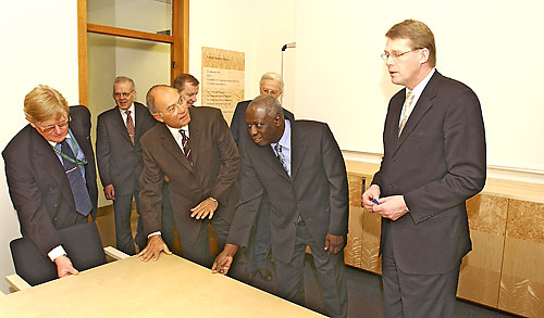 Inauguration de la nouvelle Salle des forêts de Finlande au siège de la FAO – de gauche à droite, au premier plan, Hannu Valtanen, Directeur, Fédération des industries forestières finlandaises; M. Hosny El-Lakany, Sous-Directeur général, Département des forêts de la FAO; Jacques Diouf, Directeur général de la FAO; Matti Vanhanen, Premier Ministre de Finlande; au deuxième plan: Juhani Karvonen, Directeur exécutif de l’Association forestière finlandaise; Juha Korkeaoja, Ministre de l’agriculture et des forêts de Finlande; David Harcharik, Directeur général adjoint de la FAO |