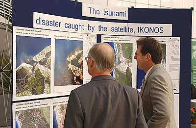 Des visiteurs à l’exposition organisée par la FAO durant le Comité des forêts comparent des photos d’étangs côtiers d’aquaculture indonésiens prises avant et après le tsunami |