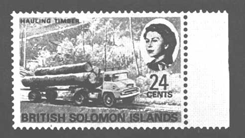 A new set of definitive stamps includes this 24 cent denomination showing a lorry hauling logs - a reference to the growing importance of the timber industry to the islands. There are a number of logging companies operating in the area, mostly for the export of loge to Japan and Australia. Species extracted include Calophyllum, a medium light hardwood which has established itself as a peeler species and furniture wood.