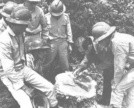 The Government of Ecuador is improving and expanding the facilities of the forestry training centre at Conocoto in order to meet the demands of the Forestry Administration for forest rangers and guards, and to train foremen and skilled workers for forest industries. The project, which is being undertaken with UNDP/FAO assistance, is also carrying out forestry extension programmes and establishing an experimental and demonstration forest. Here, the FAO Project Manager, R. Clopes Bois, explains to students how the life history of a tree can be determined by examining a freshly cut stump.