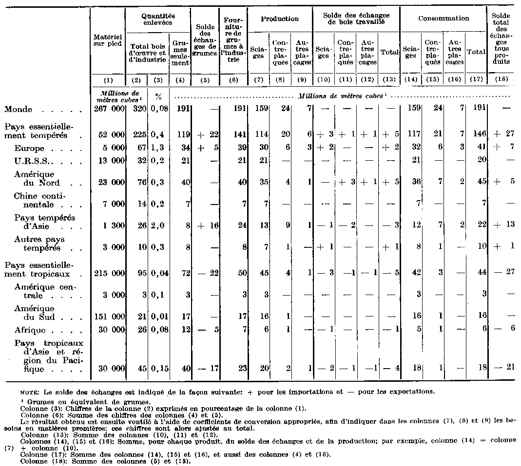 A partir des renseignements qui figurent dans la première partie de cet article¹, le tableau 16 donne un aperçu approximatif des disponibilités, de la production, du commerce et de la consommation de grumes de feuillus dans le monde, ainsi que des sciages, placages et contre-plaqués fabriqués à partir de ces grumes. On peut ainsi connaître, à un million de mètres cubes près pour chacune des colonnes du tableau, la situation telle qu'elle se présentait en 1967, exprimée en volume de grumes. Pour que les chiffres correspondent, différents écarts entre les importations et les exportations, entre les disponibilités et les besoins en grumes, etc., ont été ajustés de façon arbitraire. On a pu atténuer ainsi les variations survenues dans le matériel forestier et les divergences statistiques.
