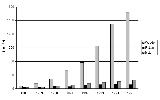 Producing countrys' secondary processing industries using rubberwood cover a large spectrum from pallet manufacturing to the most advanced export-oriented furniture and joinery manufacturers in Malaysia and Thailand. There are no recorded statistics on the amount of rubberwood logs used by the furniture industry or on the production of rubberwood furniture in the main rubberwood producing countries. However, it is estimated that in 1992 some 85 percent of rubberwood sawnwood produced in Malaysia was processed further into furniture. A tentative estimate, based on previous studies, indicates a figure of 1.6 million m3 of rubberwood logs were used for sawnwood production in Malaysia in 1995. Assuming a 33 percent average sawnwood yield, this would give 520,000 m3 of rubberwood sawnwood production (6 percent of total sawnwood production in Malaysia) and, using a yield of 50 percent for sawnwood to finished products, some 220,000 m3 of secondary products production from rubberwood.