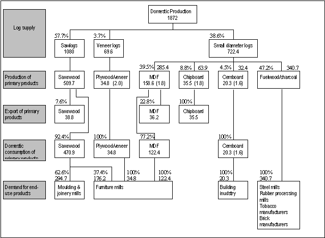 Figure 8 Flow of rubberwood logs and primary products in Malaysia in 1992