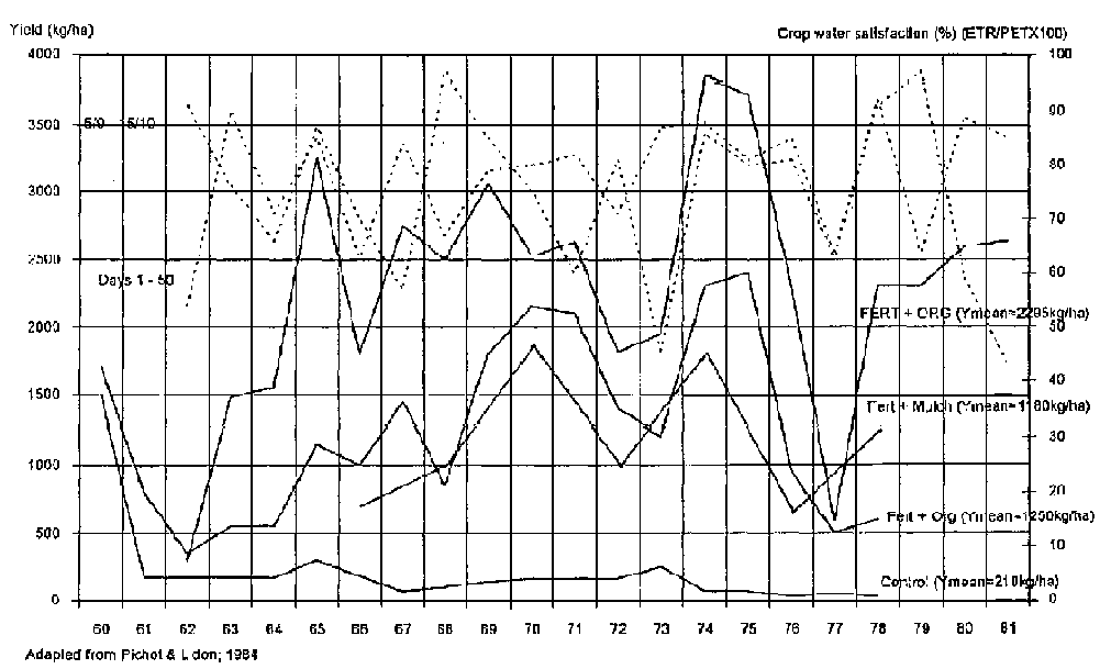 In the same figure is plotted the rate of crop water satisfaction (ratio of real evapotranspiration (ETR) to the potential evapotranspiration (PET) for each year; (i) during the first 50 days of crop growth, and (ii) from 5 September to 15 October. There is, not surprisingly, a correlation between crop water deficit and grain yield, especially during the first 50 days of crop growth. But what is also interesting to note is the large permanent difference in yield level, independent of crop water deficit, between the different soil management techniques. Monoculture of sorghum with no fallows and no external mineral inputs (Control) leads to a yield decline from around 1 500 to 200 kg/ha already after 2 years of cultivation. The yield seems to stabilize on this lower level, thereafter only slowly decreasing, and attains at the end of the series not more than around 150 kg/ha. All the other treatments present large fluctuations, due to the hydroclimate, but the yields are "stabilized" on a higher yield level, where even the absolute lowest yields are at least three times higher than the purely "nutrient mining" sorghum crop. The average crop yield for the strongly fertilized sorghum crop is 2 295 kg/ha (FERT + ORG), i.e. more than 10 times higher than the control (average yield = 208 kg/ha). The crop with low input of mineral fertilizers and low levels of manure (Fert + org) attains an average yield of 1 250 kg/ha, around 6 times higher than the control. Finally, the crop with input of crop residues (Fert + mulch) reaches a similar average yield level to the crop with low inputs; around 6 times higher than the control (Y = 1180 kg/ha).