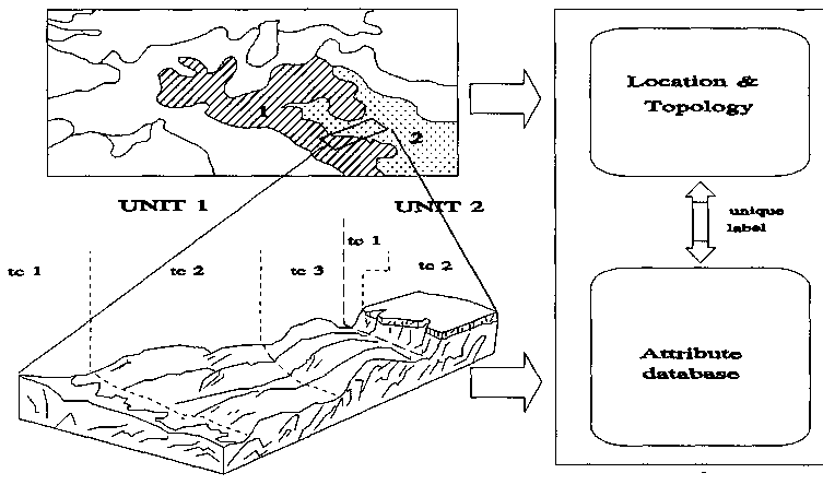 Two types of data are present in the SOTER database. The geometric component, indicating the location and topology of SOTER units, is stored in that part of the database that is handled by GIS software. The attribute component, describing the non-mappable SOTER unit characteristics is stored in a separate set of attribute files, handled by RDMS software. The two types of data components are linked by a label, unique for each SOTER unit (see Figure 1).