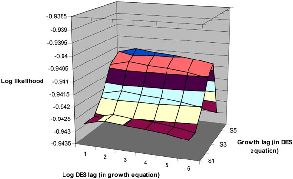 Figure 8 is a three-dimensional graph on the choice of (tg, td) for column 1. The final choice of (2,5) is obviously the peak of the surface. However, the lag in the growth equation (with lagged log DES) seems to be far more robust than it is in the DES equation (with lagged growth) because the likelihood does not change much from changes in log DES lags. As a result, td = 5 may be a fragile result.
