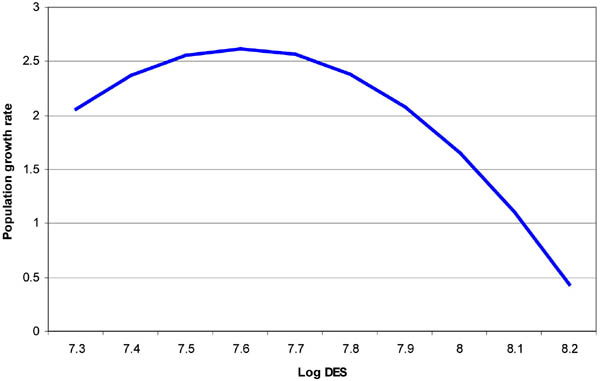 which implies an "inverse-U-shaped relation between population and DES. Figure 9 shows the estimated function for DES from about 1 500 to 4 000 kcal/day.[35] Before reaching the peak of the function, an increase in DES will increase population growth, thus the population is likely to be stuck in the low nutrition trap. This function reaches its peak at about 7.6, which is about 2 000 kcal/day. Table 8 reports countries that fell into this category during the four decades covered in the sample. Sub-Saharan Africa accounted for about one-third of the countries in this category, and little has changed over the past four decades. In the meantime, most East and Southeast Asian countries have escaped from the trap.