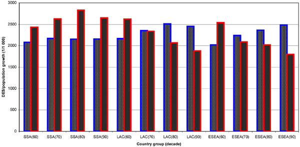 Figure 10 shows the decade and country group nutritional level changes and the population growth rate. Each pair of twin bars is for a country group and a specific decade. The left-hand bar is the DES level, and the right-hand bar is the population growth rate (multiplied by 1 000). It is obvious that sub-Saharan African countries have experienced substantial increases in population growth, and this should be an important reason for the almost constant DES level during the four decades. On the other hand, economies in both Latin America and the Caribbean, and East and Southeast Asia are able to reduce their population growth rates continuously, thus their per capita DES is constantly improving.