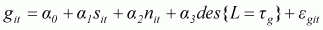 As already mentioned, forcing the correlation to be fixed at one period may be problematic. We thus added an additional lag to the right-hand sides of both Equations 50 and 51. That is, g depends on both the log DES lagged tg period and the tg+1 period, but in order to maintain easy computability we restricted these so that they have the same coefficients. That is, we assumed that g depends on the average of log DES of period tg and tg+1. In Equation 51, we added the growth rate of GDP for period td+1 to the right-hand side, with the same coefficient as for the period td. Column 3 reports the results. With the exception of the negative sign for the coefficient of lagged log DES - which has become insignificant - these results are almost the same as those reported in column 1. Another minor change is that the most probable lag for the second equation is four years instead of five years. As, in this specification a four-year lag includes the five-year lag by construction, this does not pose a contradiction to the previous result.