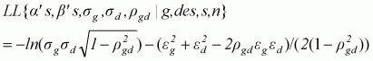 Notes: t-values in parentheses. Growth rates are multiplied by 100 to facilitate numerical calculation (same reason for taking logarithms of DES). In order to bound the variances and correlation coefficient, exponential function is used to transform the standard deviations and (exp(x) - exp(-x))/(exp(x) + exp(-x)) to transform the correlation coefficient function. The purpose is to bind standard deviation above zero, and correlation coefficient within (-1,1). Thus, for column 1 the standard deviations and correlation coefficients are (4.90, 0.19, 0.05), for column 2 they are (4.90, 0.19, 0.07), and for column 3 they are (4.90, 0.19, 0.05).