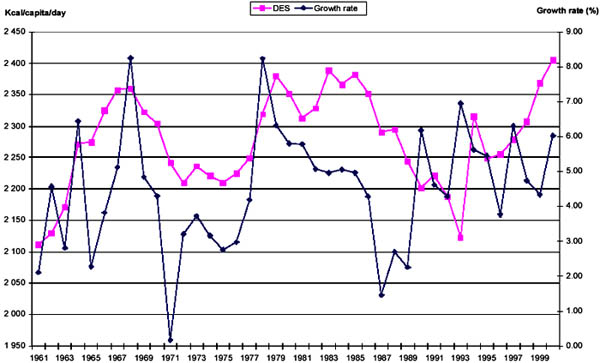 As in most developing countries, data on daily energy and protein intake are not available for Sri Lanka; therefore, data on the availability of energy and protein are considered proxies for the nutritional status of the country. Figure 1 shows the pattern of DES during 1961 to 2000. As the figure shows, during this period DES increased from 2 274 kcal in 1965 to 2 405 kcal in 2000. There were considerable fluctuations during the study period. A significant drop in calorie availability occurred during 1971 to 1977, coinciding with the tied economic policies adopted during this period and the oil shock on the world market.