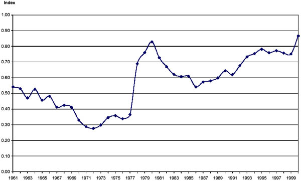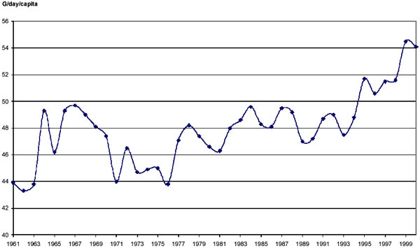 As shown in Figure 3, per capita daily protein intake increased from 46.2.g in 1961 to 54.1 g in 2000. Reductions during 1970 to 1977 are attributed to the adoption of more inward economic policies and oil shocks in the world market. Compared with the pattern of DES, there was less fluctuation in protein availability during the study period.