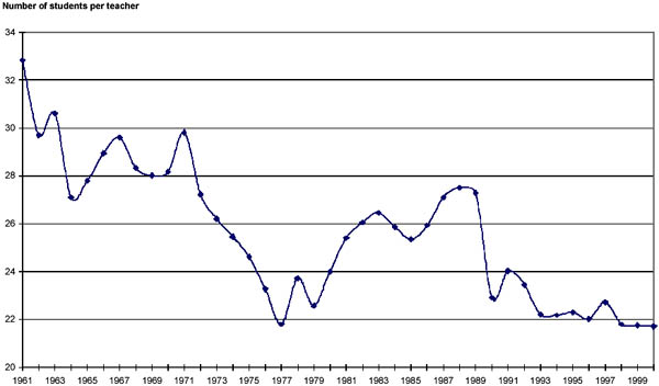 This study uses the student-teacher ratio as a proxy for the quality of education, which in turn represents the quality of human capital. Figure 4 presents the student-teacher ratio during the period. There were some fluctuations over the years, but overall there has been a significant decrease in the number of students allocated to each teacher over the study period.[40] In 1961, there are 32.8 students per teacher; this figure declined to 21.7 students per teacher in 2000, which is the lowest in the study period. The changes in the pattern of student-teacher ratios were due to changes in student enrolments and changes in policies for teacher recruitment. The sharp drops during 1977 and 1990 were caused by the new teacher recruitment programmes that were introduced by newly elected governments.[41] Not only in Sri Lanka but also in developing countries in general, education is a major determinant in the development of human capital. During the study period, despite volatility, educational performance improved significantly. Political interest in education is the key factor for achieving good performance in education. By 1999, nearly all children in the relevant age group were enrolled in primary education. As there are sufficient reasons to believe that Sri Lankan human capital development depends mainly on achievements in the education sector, the student-teacher ratio is one of the best proxy indicators for the quality of human capital.