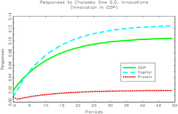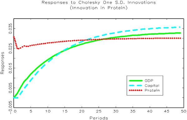 This study reports two sets of impulse response functions: one is for one standard deviation innovation in protein, and the other is for one standard deviation innovation in GDP. The responses of GDP, capital and protein are plotted for both scenarios. Each period corresponds to one year.