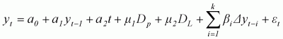 Dp is a pulse dummy when t = t + 1 Dp = 1, and zero otherwise. The pulse dummy makes it possible to identify time change in the drift. DL represents the level dummy such that DL = 1 when t> t, and zero otherwise. The level dummy is used to identify change in both the mean and the drift. The t statistics for the null of a1 = 1 are compared with the appropriate critical value calculated by Perron. The Perron tests critical values are varied with the value, l, the ratio of t to T. T is the total sample size.