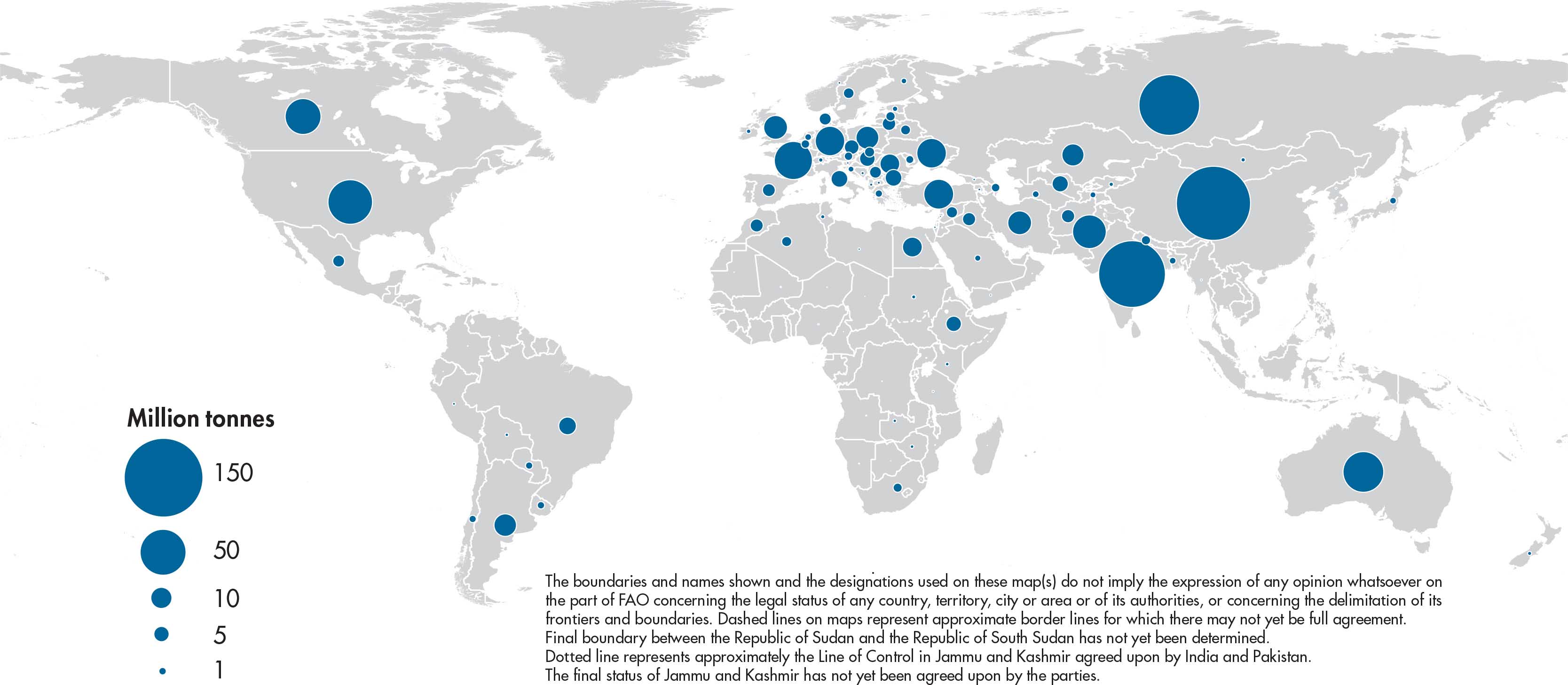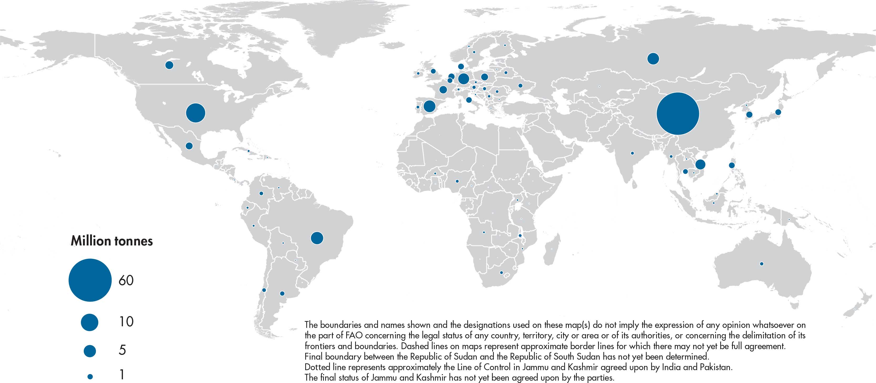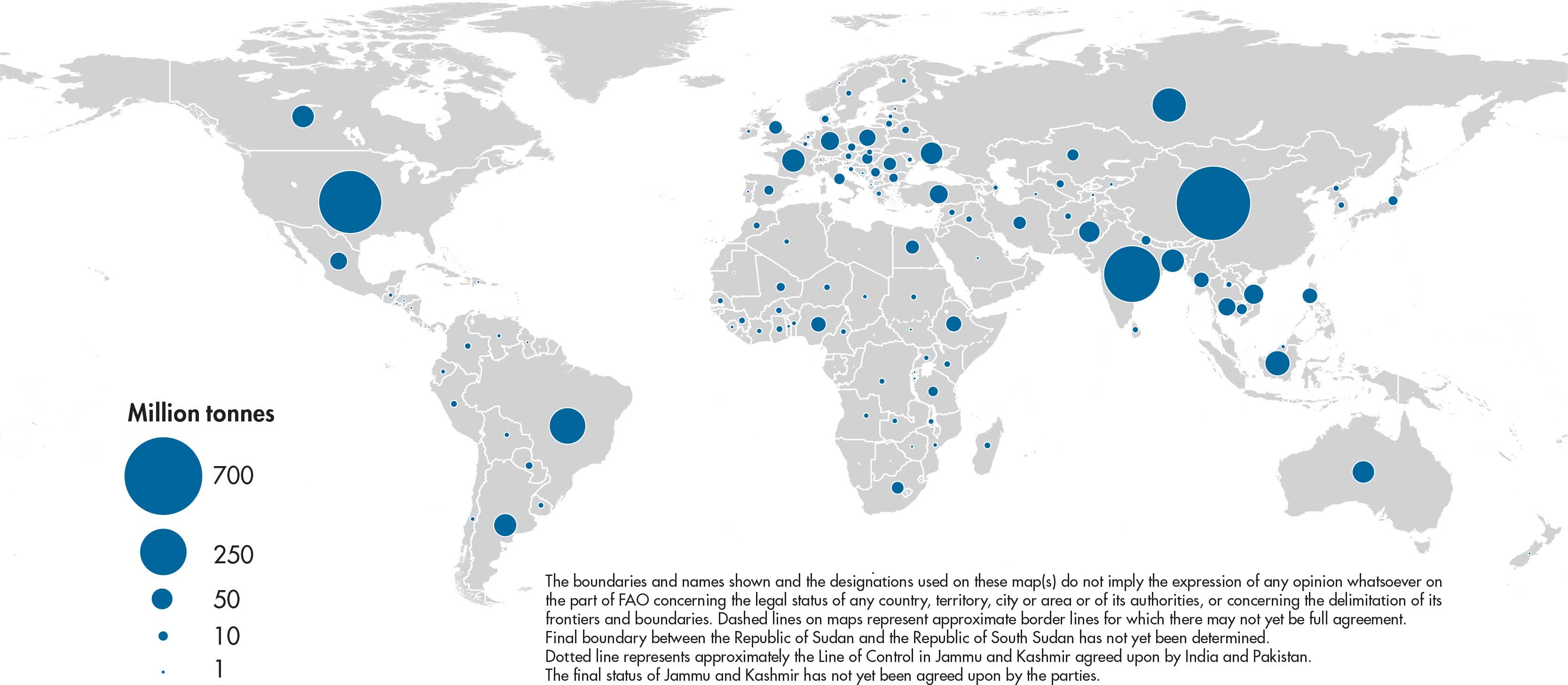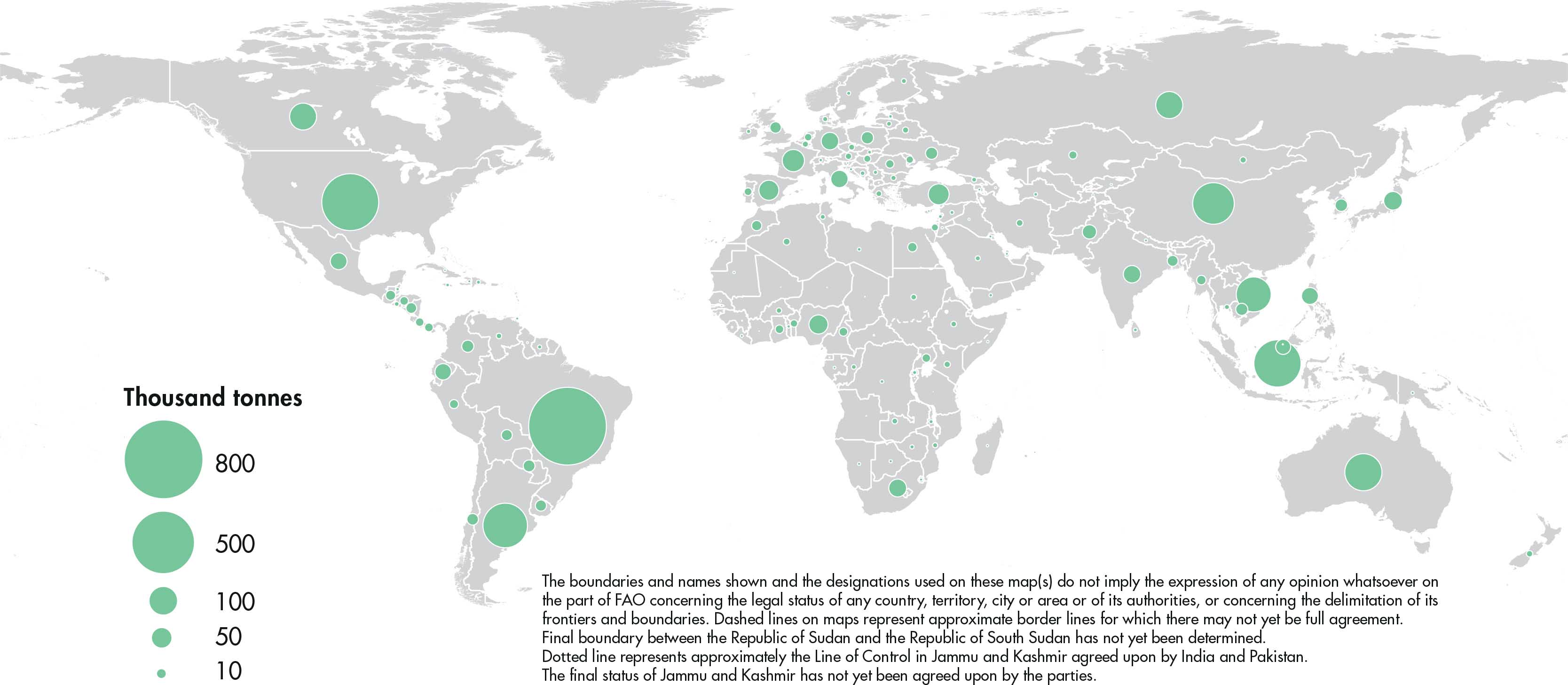 Figures relate to the total domestic production inside or outside the agricultural sector, i.e. they include non-commercial production and production from kitchen gardens. Unless otherwise indicated, production is reported at the farm level for crop and livestock products (i.e. in the case of crops, excluding harvesting losses) and in terms of live weight for aquatic animal products (i.e. the actual ex-water weight at time of catch). All data shown relate to total meat production from both commercial and farm slaughter. Data are expressed in terms of dressed carcass weight, excluding offal and slaughter fats. Production of beef and buffalo meat includes veal; mutton and goat meat includes meat from lambs and kids; and pig meat includes bacon and ham in fresh equivalent. Poultry meat includes meat from all domestic birds and refers, wherever possible, to ready-to-cook weight.