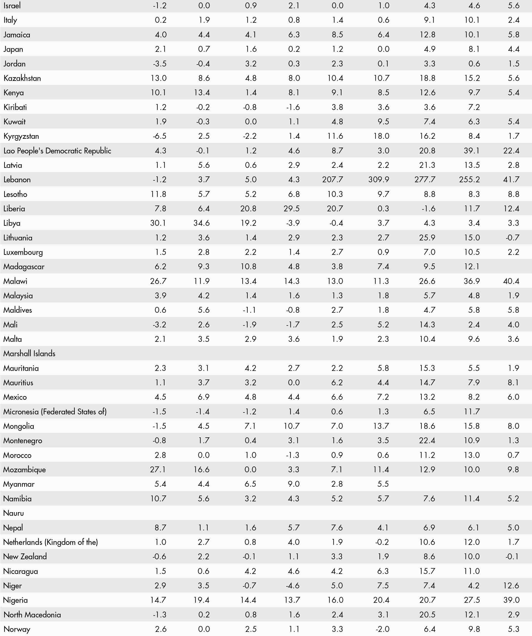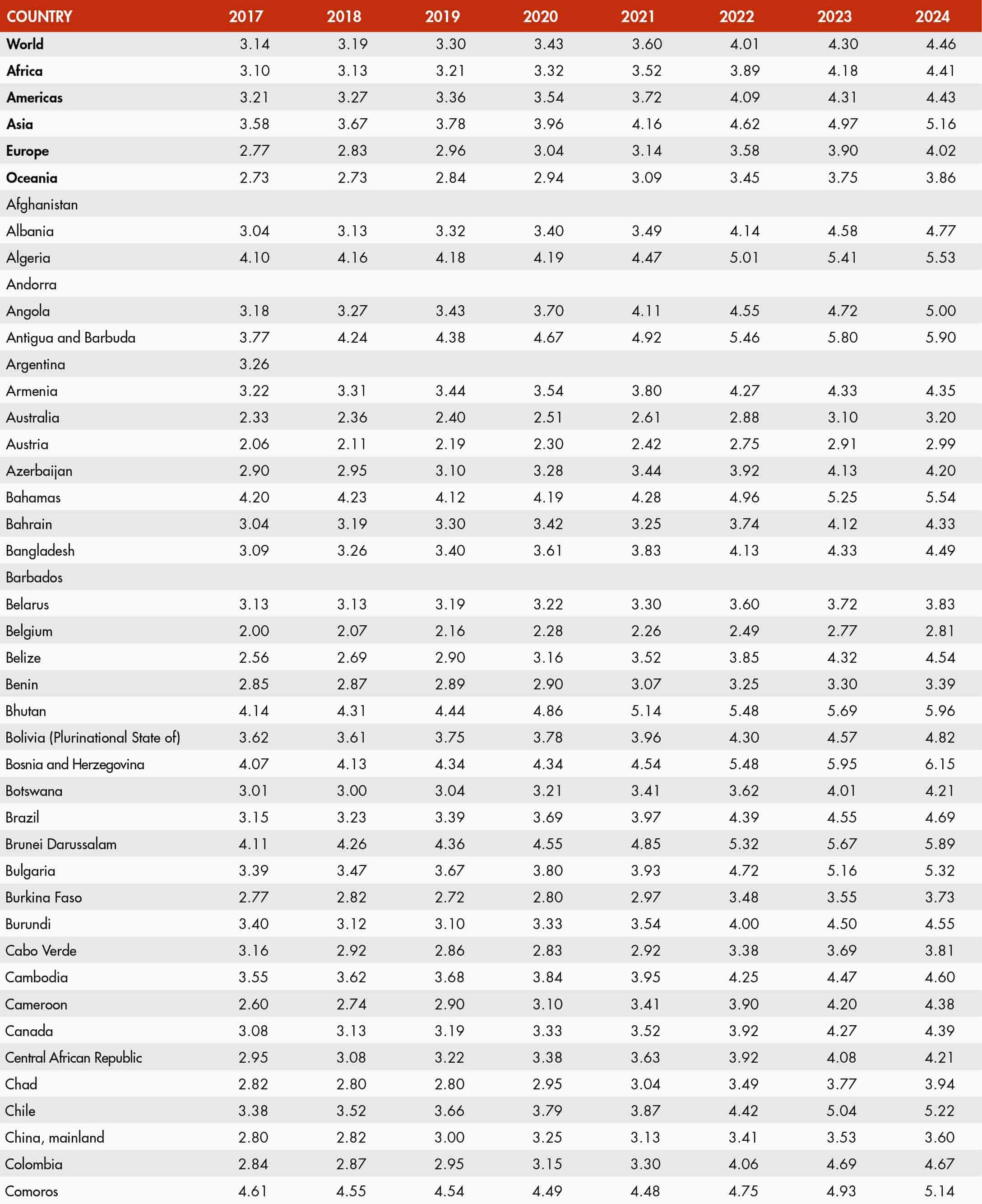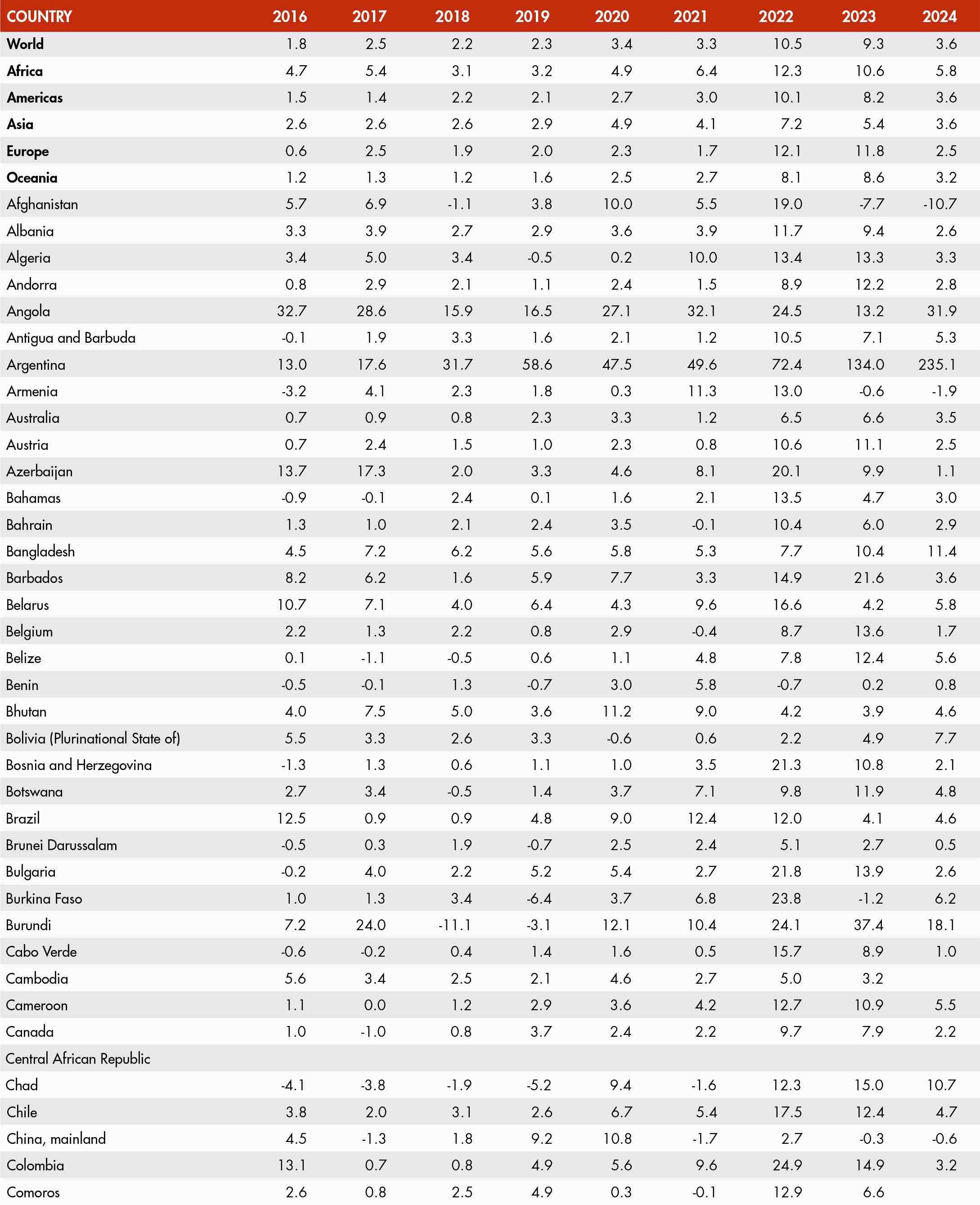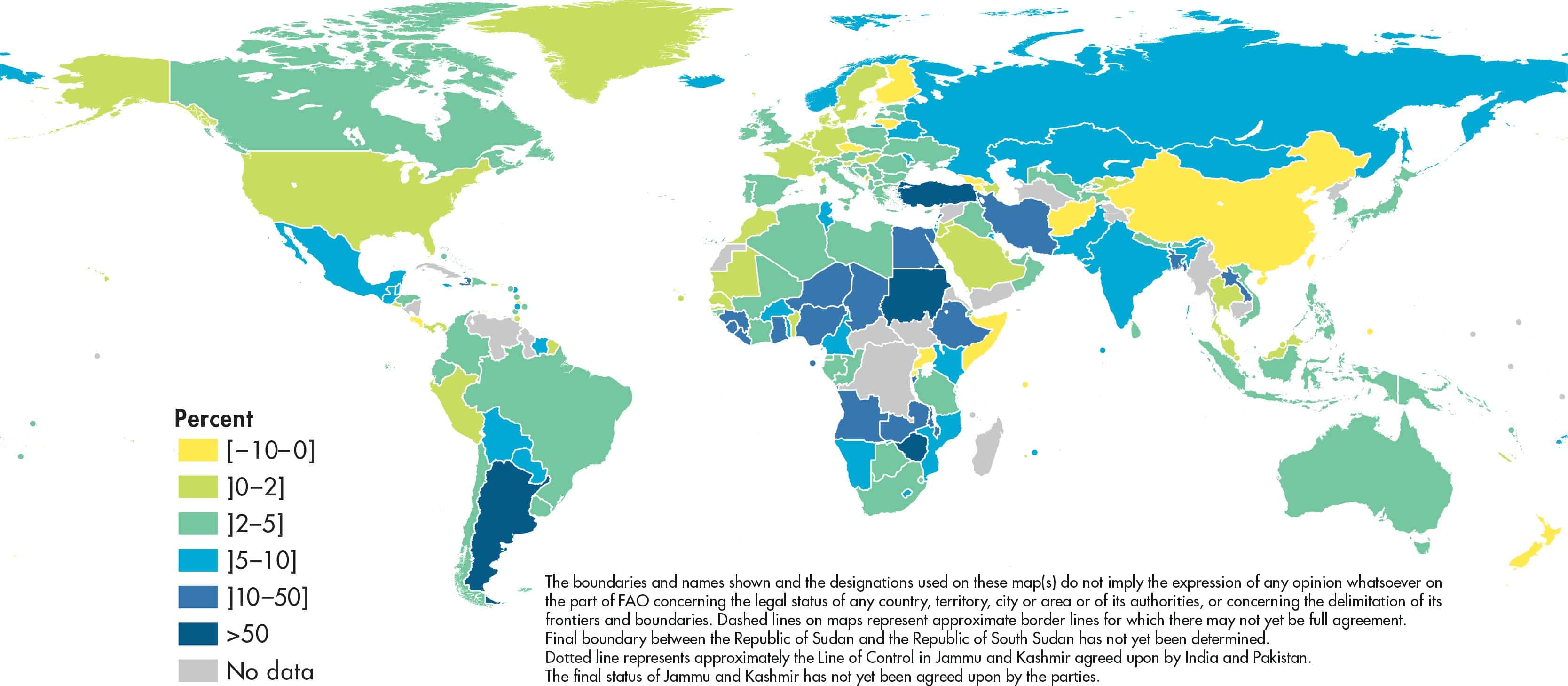 The inflation rate of an index for any month refers to the percentage change in the index value for the month as compared with the index value of the corresponding month of the previous year. Global and regional food consumer price inflation measures food inflation for a group of countries at different geographical scales: Africa, Europe, Oceania, Latin America and the Caribbean, Northern America, and Asia. Global and regional inflation are calculated using household consumption expenditure weights.