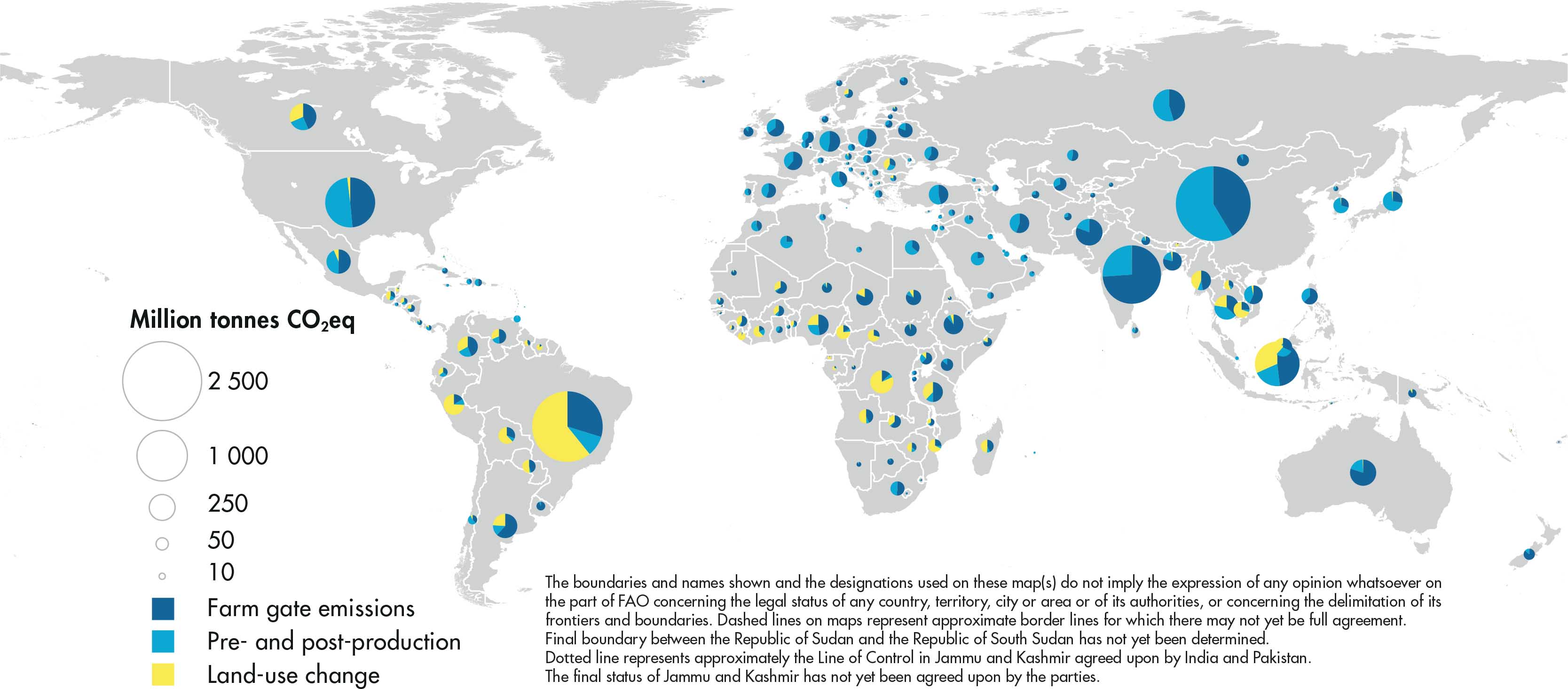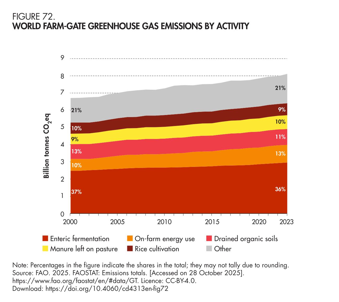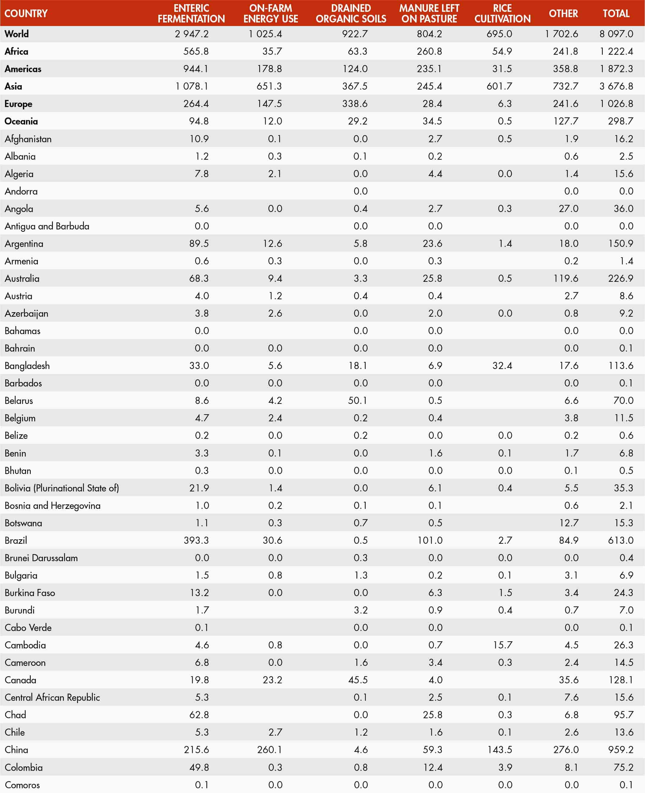 Farm-gate emissions cover all agricultural processes within farms related to crop and livestock production (enteric fermentation, manure management, rice cultivation, synthetic fertilizers, manure applied to soils, manure left on pastures, crop residues, drained organic soils, burning of crop residues, savanna fires), including energy use and drained organic soils within the farm. Non-CO2 gases, namely CH4 and N2O, are produced by crop and livestock production and management activities whereas CO2 emissions are produced from the drainage of organic soils and on-farm use of fossil-fuel based energy (including electricity and heat generated off farms). Emissions are computed following Tier 1 Intergovernmental Panel on Climate Change (IPCC) 2006 Guidelines for National GHG Inventories.