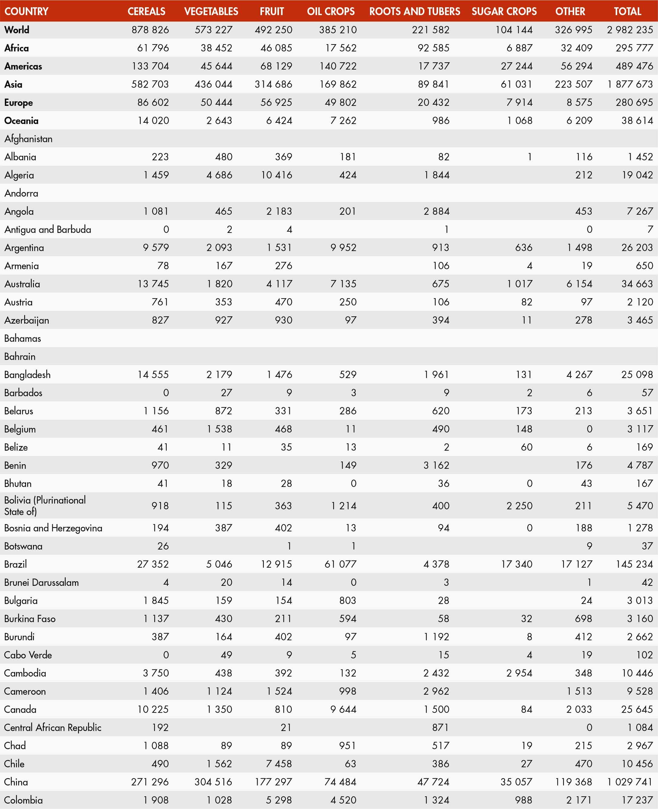 Vegetables, as classified in this group, are mainly annual plants cultivated as field and garden crops in the open and under glass and are used almost exclusively for food. Vegetables grown principally for animal feed or seed should be excluded. Certain plants, normally classified as cereals and pulses, belong to this group when harvested green, such as green maize and green peas. Chillies and green peppers are included in this grouping when they are harvested for consumption as vegetables and not processed into spices. Trade data for fresh vegetables also include chilled vegetables, meaning the temperature of the products has been reduced to around 0 ˚C without the products being frozen. Fruit crops consist of fruits and berries that, with few exceptions, are characterized by their sweet taste. Nearly all are permanent crops, mainly from trees, bushes and shrubs, as well as vines and palms. Fruit crops are consumed directly as food or are processed into dried fruit, fruit juice, canned fruit, frozen fruit, jam, alcoholic beverages and other products.