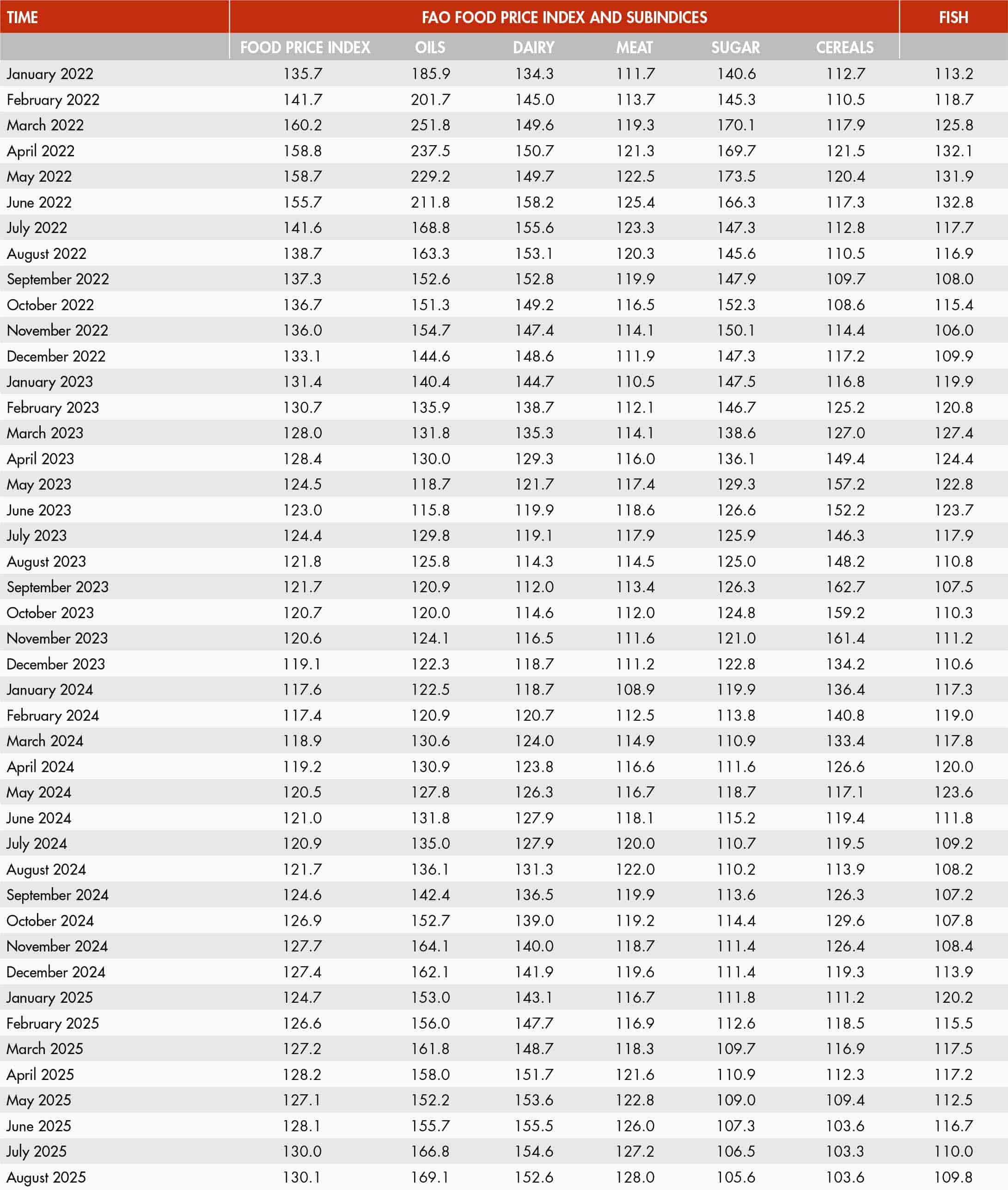 The FAO Food Price Index is a measure of the monthly change in international prices of a basket of food commodities. It consists of the average of five commodity group price indices (meat, dairy, cereals, vegetable oils and sugar), weighted with the average export shares of each of the groups for 2014–16.