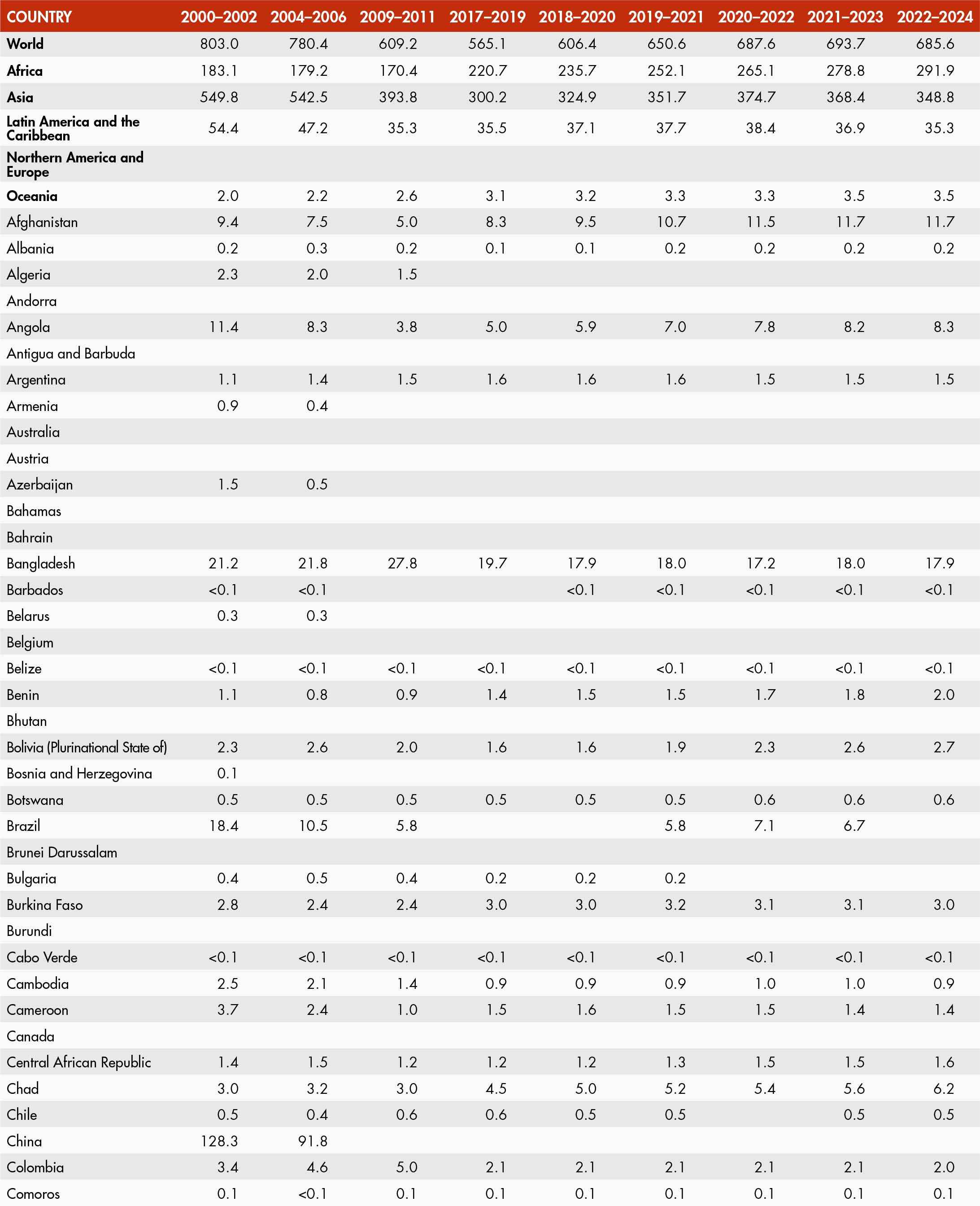 The number of people undernourished is obtained by multiplying estimates of the proportion of undernourished for each country by estimates of the total population. Undernourishment refers to the condition of people whose dietary energy consumption is continuously below a minimum dietary energy requirement for maintaining a healthy life and carrying out light physical activity.
