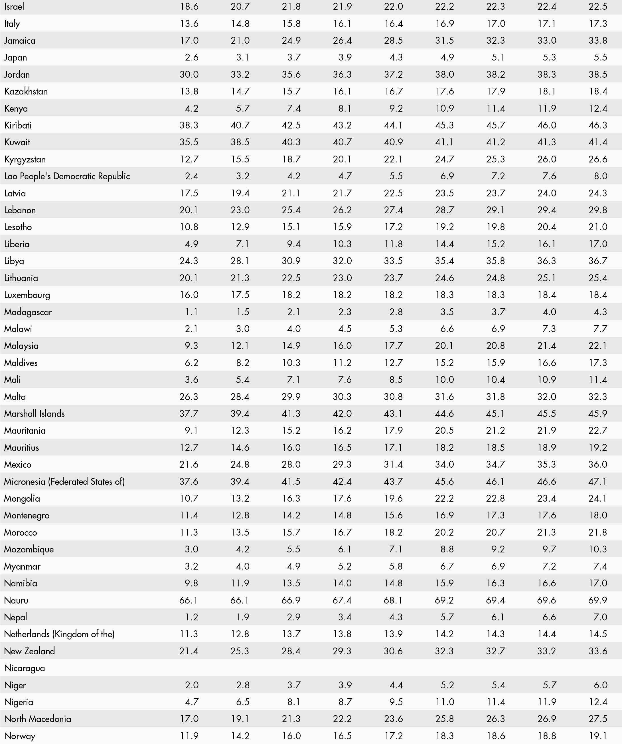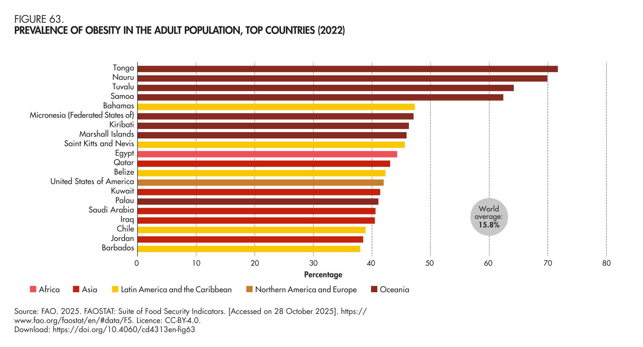 63. Prevalence of obesity in the adult population, top countries (2022)