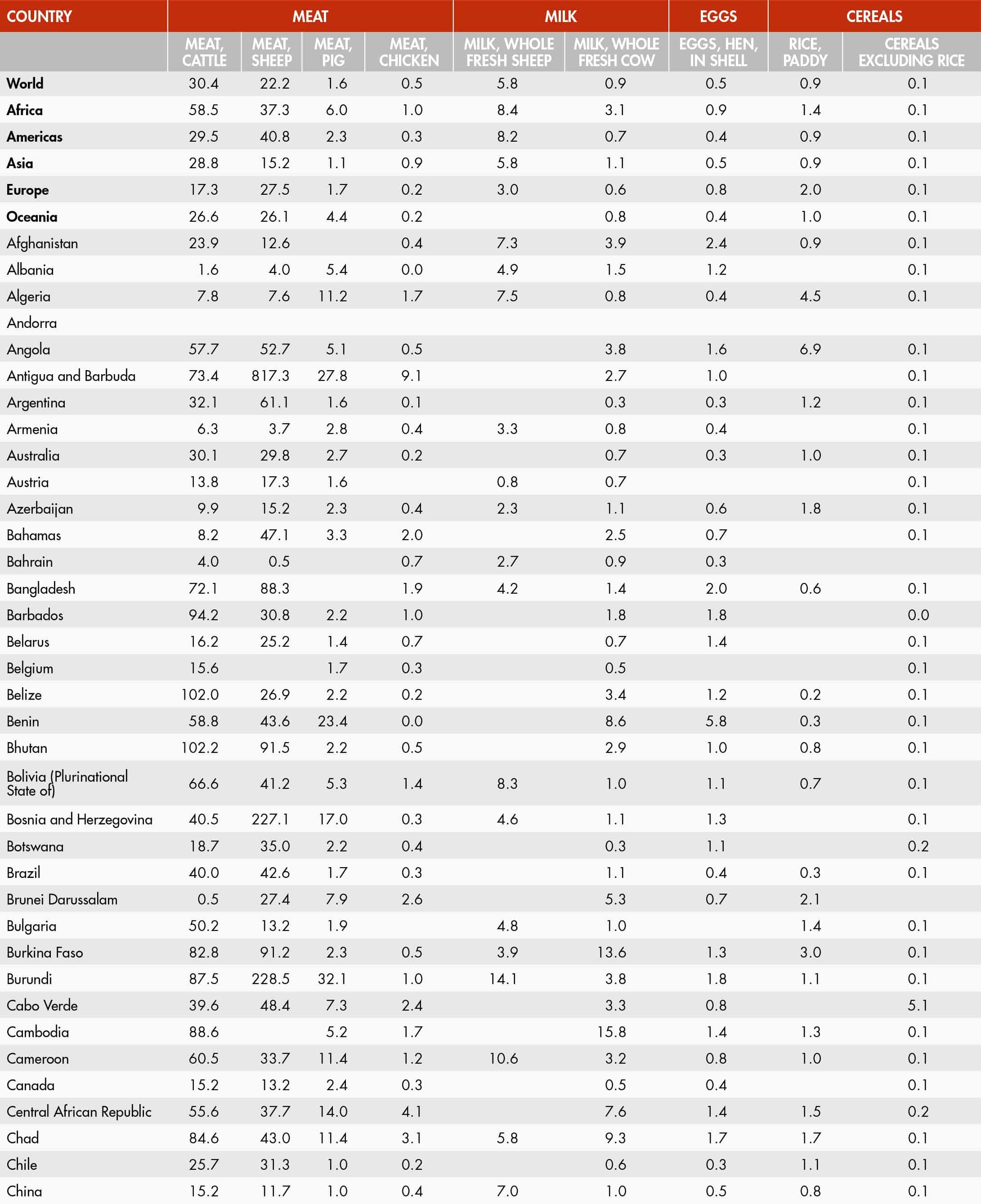 Greenhouse gas emissions within the farm gate per unit weight of product, expressed in kg CO2eq/kg of product. The indicator is computed for six types of meat (buffalo, cattle [beef], chicken, goat, pig and sheep), four types of milk (camel, cow, goat and sheep), hen eggs, rice, and other cereals (combining the intensities of barley, maize, millet, oats, rye, sorghum and wheat).