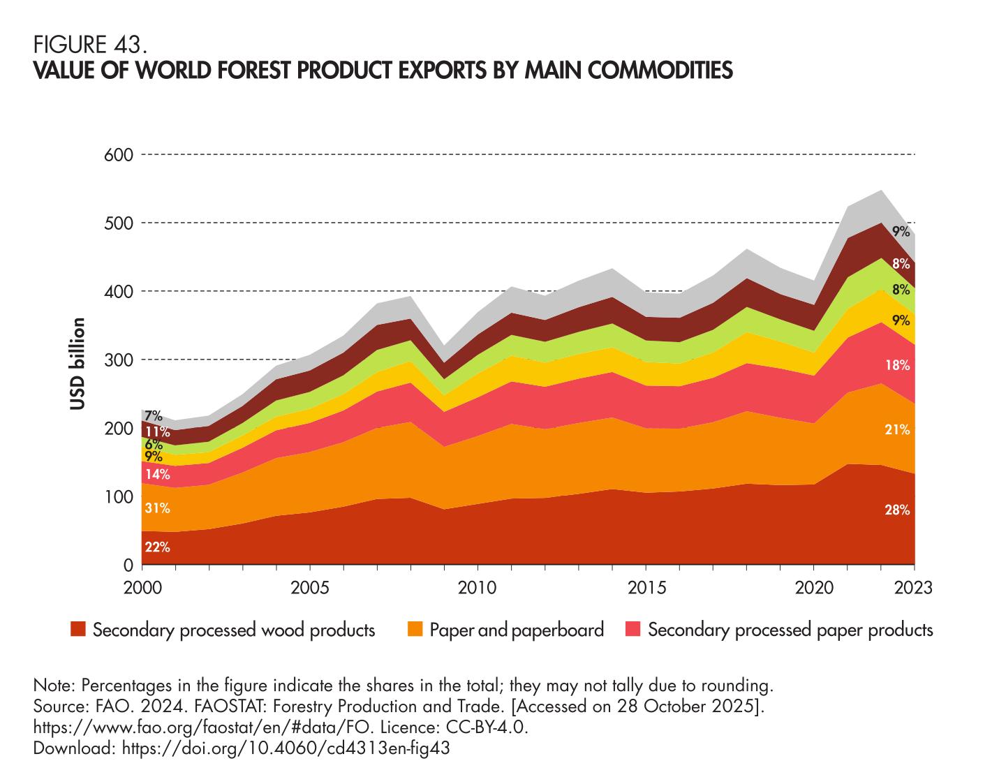 43. Value of world forest product exports by main commodities