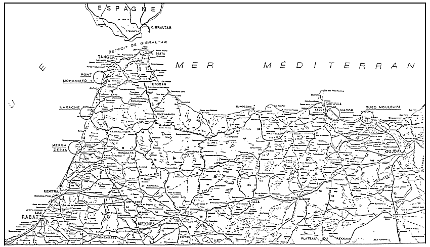 La seconde partie de la mission a été consacrée aux visites sur le terrain et aux essais de peche dans les sites de la cote intéressantes pour la possibilité d'exploitation des ressources en alevins. Il a été visité en particulier l'embouchure de l'oued Moulouya sur la cote méditérranéenna, à l'est de Nador et les embouchures des oueds Tahadart et Loukkos et la lagune de Merja Zerga sur la cote atlantique. Il a été possible d'avoir une vue aérienne de ces sites sur l'Atlantique grace à l'avion mis à la disposition de la mission par la Soc. MAROST pour le transfert à Tanger (v. photo).