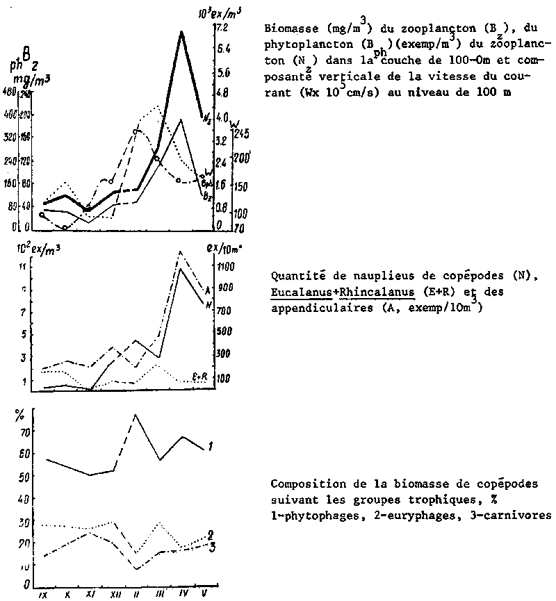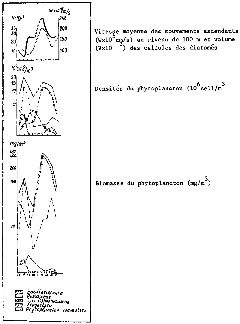 Les variations saisonnières de l'intensité de l'upwelling exercent une grande influence sur la communauté planctonique. On voit changer non seulement les effectifs et les biomasses de phyto et zooplancton, mais aussi toute la composition de la communauté planctonique: on observe la substitution progressive des groupes dominants d'algues, de la composition par âge et trophique du zooplancton, de la profondeur de son habitat. Les diatomées réagissent aux changements de l'upwelling plus rapidement par des changements de densités et de dimensions des cellules et cela non seulement pour ce qui est des fluctuations saisonnières, mais aussi des variations à courte période (Fig. 1 et 2).