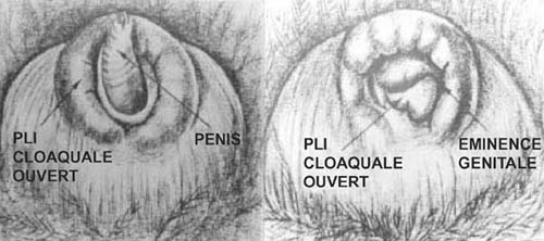 Contrairement aux poussins (Gallus gallus), le sexage des oisons d'un jour par l'orifice cloacal n'est pas très difficile: avec un peu de pratique cela devient même une tâche très aisée. La figure 14 montre comment tenir un oison de manière à faire saillir ses organes reproducteurs. Cette procédure doit être effectuée sous un éclairage puissant pour que la personne affectée au sexage puisse identifier clairement les organes sexuels. La figure 15 montre un agrandissement des organes sexuels mâle et femelle.