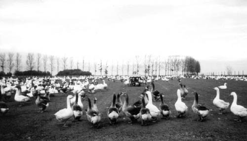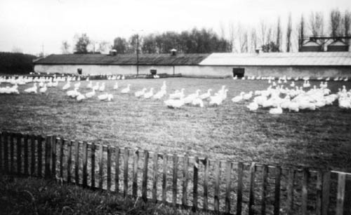 FIGURE 18. Des oies conservées dans quatre systèmes de logements différents (a, b, c et d) pendant la période d'élevage.