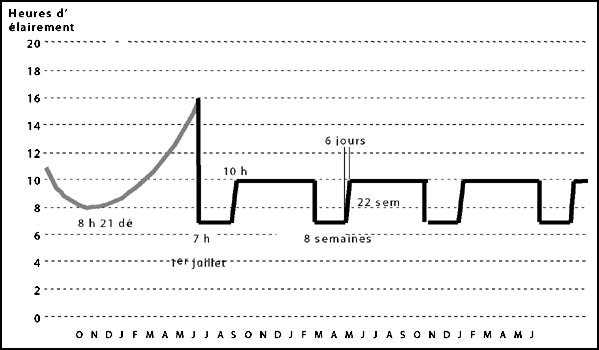 Certains producteurs laissent parfois leurs oies se reposer pendant deux ou quatre semaines avant d'entreprendre un nouveau cycle de ponte. La pratique vise cependant à réaliser six cycles complets de ponte en 4 ans, ce qui se traduit par une production supplémentaire de 30 à 40 pour cent d'ufs par rapport aux quatre cycles naturellement obtenus pendant cette même durée de 4 ans.
