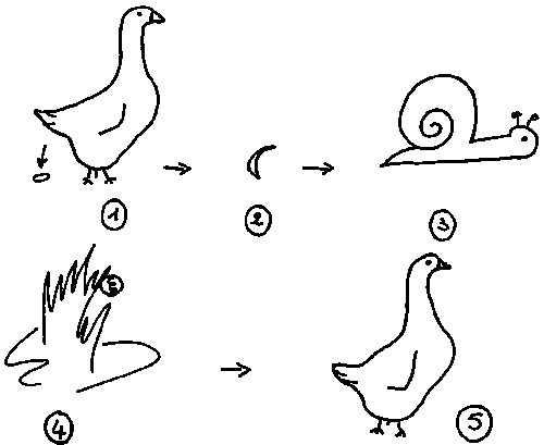 (1) Une oie infestée évacue des ufs de douves en déféquant.