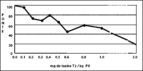 FIGURE 51. Effet du niveau d'ingestion de toxine T-2. Pénalisation de la production d'ufs (base 100 = ponte normale).
