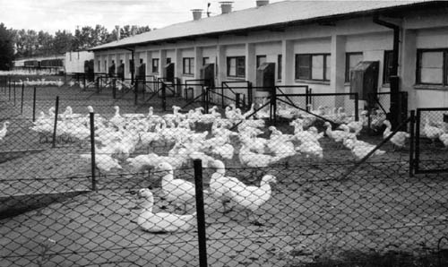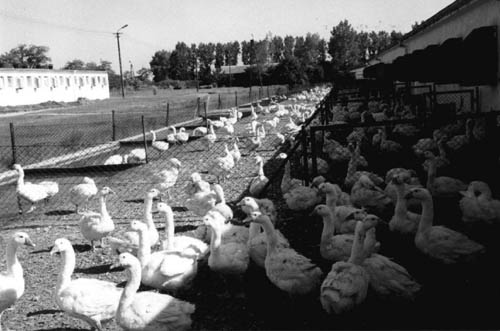 Les meilleures pâtures pour les oies sont constituées d'un mélange de plantes légumineuses et d'herbes. Les espèces suivantes sont couramment utilisées, herbes courtes: Lollium perenne L., Festuca ovina L., Festuca rubra L. et Poa pratensis L., herbes résistant aux ravageurs et à la verse: Phleum pratense L., Festuca pratensis Huds. et Lolium italicum A.Por. Les légumineuses représentent 10 à 20 pour cent de la pâture. Lorsque les prairies naturelles font défaut, les oies sont installées dans des vergers, des chaumes ou des friches de divers types, dans ce cas il faut leur apporter du fourrage récemment coupé. Au printemps, les premiers fourrages sont obtenus avec des orties, du colza d'hiver et du seigle auxquels on ajoute des légumineuses telles que les fèves. Plus tard, on dispose du blé d'hiver et des céréales de printemps (avoine et orge). En été, on peut distribuer l'herbe qui provient d'une seconde coupe. A partir de la mi-août, le maïs et le tournesol (plante entière), la troisième coupe d'herbe et les feuilles de betteraves sucrières sont de bonnes sources de verdure pour les oies. Les oies sont placées sur des chaumes après les moissons ou les récoltes, elles glanent et profitent de tout ce qu'elles trouvent. En octobre, on distribue des choux frisés, ou des racines (carottes fourragères ou betteraves semi-sucrières). Parfois, on propose de la pulpe de betterave fraîche, des pommes de terre cuites à la vapeur, ou divers ensilages comme nourriture. En novembre, les jeunes jars et les femelles conservés pour la reproduction sont confinés. La plupart du temps, on choisit des animaux de même âge pour constituer un troupeau de reproducteurs. Eventuellement, on peut tolérer deux semaines de différence dans le cas où les mâles sont les plus âgés. Après la constitution du troupeau de reproducteurs, aucun changement n'est possible, sauf les éliminations pour raisons sanitaires. Les femelles sont enfermées, mais elles ont accès à un parcours extérieur dans la journée. C'est seulement en période hivernale très froide que les oies sont conservées à l'intérieur tout le temps. Les bâtiments pour les reproducteurs dépendent du système d'élevage et des effectifs. On trouve des bâtiments conçus spécialement pour ce type de production, mais aussi des poulaillers destinés à d'autres espèces aviaires. Certains bâtiments sont obscurs, d'autres ont des fenêtres. Le chauffage et les systèmes de ventilation dynamique sont optionnels. Par contre, il y a toujours un parcours extérieur adjacent (figure 5). Quelques bâtiments modernes où l'ambiance et les programmes lumineux sont parfaitement contrôlés ont été construits dans les années 90. Mais en majorité dans des petites unités, on trouve des granges, d'anciennes porcheries ou d'autres bâtiments agricoles transformés. Bien souvent, les coûts inhérents aux transformations ne sont pas très élevés. Les murs doivent être calfeutrés pour éliminer les courants d'air, les plafonds isolés et les sols refaits. Il faut aussi pratiquer des ouvertures pour l'accès aux parcours extérieurs. Des arrivées d'air additionnelles ou des fenêtres sont souvent nécessaires pour assurer une ventilation correcte. Certains bâtiments ne sont pas chauffés, ce qui ne pose pas de problèmes insolubles aux animaux en dépit de la rigueur des hivers polonais. Toutefois, par grand froid, les risques de manque d'eau à cause du gel sont à prendre en considération. La température optimale du bâtiment pendant la saison de reproduction se situe aux alentours de 5 ou 8°C.