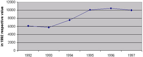 In 1993, the Support and Guarantee Fund for Agriculture and Forestry (SGFAF) was founded. This fund offers guarantees for bank credits and refunds a portion of interests paid by farmers. The maximum level of guarantee ranges from 30 percent to 80 percent. The level of interest subsidies is defined by the SGFAF in compliance with its real financial possibilities. The interest rate paid by a client has to amount to 1 percent at least. In the period of 1994 - 1998, the bank loan interest rate for agriculture was on average 17.58 percent[20] and the average interest rate subsidy from the SGFAF amounted to 12.32 percent. This means that the nominal interest rate paid by a client was reduced to 5.26 percent (Silar, Doucha, 1999). As a result of the operation of the support and guarantee fund, investment activity in agriculture has improved since 1994. The annual real investment level was 75 percent higher between 1995 and 1997 than in 1993.