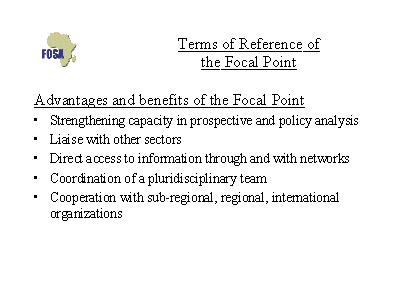 · National focal points for FOSA - each country has been invited to nominate a FOSA National Focal Point for the study. These focal points may identify two other partners (contact points) in each country to cover the private sector and non-governmental/civil society perspectives. The national focal points are invited to attend the sub-regional planning meetings (and other meetings as the need arises) and will be responsible for the production of the country outlook study and for provision of other support at the country level in the implementation of FOSA.