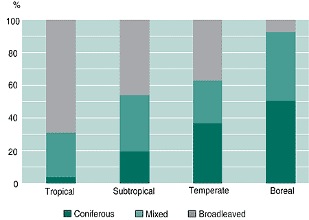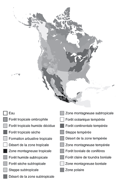 Le groupe de travail a créé une base de données intégrée, à référence géographique, sur les inventaires forestiers, sur la base des données nationales, en utilisant les zones écologiques qui ont servi de cadre à la FAO pour l’établissement du rapport sur l’Évaluation des ressources forestières mondiales 2000 (ERF 2000). La FAO a délimité 20 zones écologiques pour l’Amérique du Nord – six zones tropicales, cinq zones subtropicales, cinq zones tempérées, trois zones boréales et une zone polaire. (figure 1). La superficie et le volume sur pied des forêts ont ensuite été ventilés par type de forêt (conifères, mixtes et feuillues). Les terres ont été classées selon le régime de propriété (public ou privé). La figure 2 illustre la distribution de la superficie forestière, par zone écologique, alors que la figure 3 montre la répartition des types de forêt par catégorie de zone écologique.Malheureusement, les limites des zones écologiques de la FAO ne correspondaient pas tout à fait aux limites du cadre écologique des pays individuels. Avant que les résultats des évaluations continentales ne puissent être largement diffusés, ces différences devront être aplanies afin que la somme de la superficie des terres officielle de chaque pays soit égale à la superficie totale. Dans le cadre de ce processus d’ajustement, les superficies non classées doivent être rattachées à une catégorie de couvert forestier. La base de données en voie d’élaboration pourrait fournir des indications utiles pour quatre tableaux d’informations sur les 15 figurant dans la mise à jour 2005 de l’ERF (voir tableau). Il suffirait d’harmoniser quelques variables de plus pour que la base de données puisse être utilisée pour compléter les tableaux qui ne contiennent actuellement que des données partielles. Si des données auxiliaires étaient incorporées dans l’analyse, il serait peut-être également possible de fournir des informations à l’échelle du continent sur des éléments comme les perturbations, la diversité des essences forestières, les prélèvements de bois, certains produits forestiers non ligneux et l’emploi. Les trois pays révisent actuellement leurs approches des inventaires forestiers nationaux, de sorte qu’il devrait être possible de suivre une approche plus compatible et plus facilement utilisable pour effectuer une analyse et établir un rapport à l’échelle du continent. Les consultations régulières entre les pays ont aidé à configurer les révisions nationales en guidant les trois pays vers un cadre d’inventaire et de surveillance commun pour l’Amérique du Nord. Cela devrait simplifier la compilation d’une base de données nord-américaine à l’avenir et faciliter une évaluation régionale des ressources forestières.
