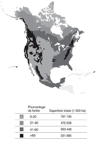 Approche régionale de l’évaluation les ressources forestières: examen du potentiel de l’Amérique du Nord La collaboration régionale peut non seulement être utile pour renforcer les capacités qu’ont les pays individuels de suivre et d’évaluer leurs propres ressources forestières, mais aussi pour établir un pont entre les évaluations nationales et mondiales des ressources forestières. En Amérique du Nord, il est de plus en plus reconnu que l’inventaire et le suivi de l’écosystème forestier sont des éléments cruciaux du succès de la mise en œuvre de la gestion forestière durable – pour formuler une politique d’utilisation et de conservation des terres efficace, évaluer les services et les avantages procurés par les forêts, planifier et mettre en œuvre les activités de gestion et suivre les résultats au fil du temps. Ces informations peuvent être directement utilisées pour l’établissement de rapports et l’évaluation des critères et indicateurs de la gestion forestière durable et elles servent de base de connaissances pour les activités de recherche-développement. Le Groupe de la Commission des forêts pour l’Amérique du Nord chargé de l’inventaire, de la surveillance et de l’évaluation étudie les possibilités d’établir un rapport à l’échelle du continent, en regroupant les données des inventaires forestiers nationaux émanant des trois pays membres de la Commission, à savoir le Canada, le Mexique et les États-Unis. Une analyse des ressources forestières à l’échelle de l’Amérique du Nord, doit être précédée de l’élaboration et de la validation d’une base de données commune sur l’inventaire, la surveillance et l’évaluation, connectée aux bases de données des pays individuels. Une fois que des protocoles ont été définis pour le partage des données et l’évaluation, il est possible d’établir des cartes interprétatives à l’échelle du continent décrivant les forêts de l’Amérique du Nord. Les différences des protocoles de mesure et de suivi adoptés par les programmes d’inventaire nationaux rendent l’approche continentale très complexe. La disparité des définitions, et plus particulièrement des définitions de la forêt, est le principal écueil à surmonter pour définir des variables communes. Certains paramètres minimaux comme la superficie minimale, la fermeture du couvert, le volume sur pied ou la productivité varient, et le classement des terres dans la catégorie des forêts ou des terres boisées dépend parfois d’un changement infime de ces paramètres minimaux. Une analyse des informations tirées des bases de données sur les inventaires forestiers nationaux des trois pays a révélé qu’une harmonisation (processus visant à assurer la compatibilité entre les différentes définitions) était possible pour les variables suivantes: