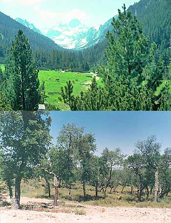 La diversité des forêts et de la sylviculture européennes compliquent considérablement l’élaboration de critères et d’indicateurs (en haut forêt de montagne en Bulgarie; en bas, peuplement naturel de chênes-liège, Quercus suber, au Portugal) |