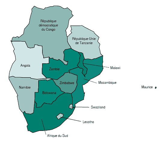 La coopération dans la SADC naît de l’histoire socioéconomique et politique de la sous-région qui a permis l’établissement de liens solides entre ses pays membres. À la fin des années 70, les cinq États de première ligne (Angola, Botwsana, Mozambique, République-Unie de Tanzanie et Zambie) ont coopéré dans le but d’aider les États à régime oligarchique à obtenir la libération politique. Plus tard, l’objectif a été élargi pour inclure la libération économique, thème du Sommet de Lusaka de 1980, «L’Afrique australe: vers la libération économique». Ce sommet prévoyait la création de la Conférence pour la coordination du développement de l’Afrique australe (SADCC) qui visait à renforcer la coopération régionale. L’indépendance de la Namibie en 1990 a représenté une nouvelle possibilité de réduire la dépendance économique vis-à-vis de l’Afrique du Sud, alors sous le régime de l’apartheid. En 1992, les chefs d’État et de gouvernement ont signé un traité au titre duquel la Conférence pour la coordination du développement de l’Afrique australe devenait la Communauté du développement de l’Afrique australe (SADC) dans le but d’accroître l’intégration régionale en instituant un cadre de coopération juridiquement contraignant. La SADC comprend actuellement 13 pays (voir la figure).
