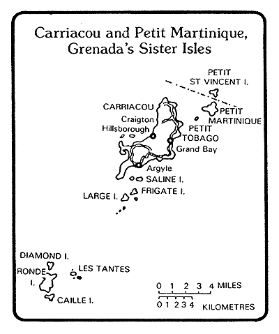 Grenada island (344 km2), the most southerly of the caribbean windward islands, is about 241 km southwest of Barbados and 145 km northwest of Trinidad. The State of Grenada also includes the 2 Carriacou and Petit Martinique islands (respectively 35 km2 and 2 km2).