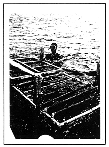 The main research programs presently focus on intensive grow-out in floating cages in protected bays. Many shapes and materials can be observed : circular, square, polygonal, in wood, iron, fiberglass, etc. The most reliable and cheapest system appears to be the horizontal cylindro-conical cages used in the French Antillas. They can be quickly sunk (immerged) in case of hurricane. Their greatest advantage consists of the automatical destruction of the fouling with the regular rotation of the cage (the superior part is above the water level and the algae are sundried).
