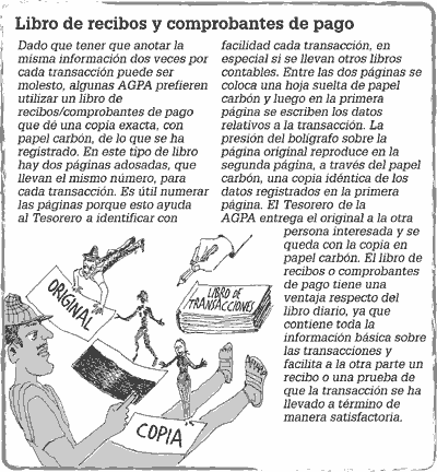 Algunas AGPA prefieren llevar dos libros separados: un libro de recibos y otro de comprobantes de pago para que la información sobre la afluencia de recursos (en efectivo y no en efectivo) no se confunda con los datos sobre el egreso de recursos (en efectivo y no en efectivo). Le corresponde a cada AGPA decidir qué sistema le resulta mejor.