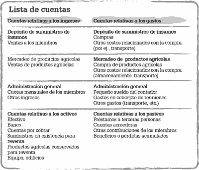 Para determinar qué tipo de cuentas hay que llevar, puede resultar útil elaborar un "diagrama de las cuentas", es decir, un plan de cómo registrar, de manera sistemática, la información financiera sobre las actividades de prestación de servicios a los miembros de la AGPA. El número y las categorías de las cuentas dependerán de las necesidades de datos económicos y comerciales de cada AGPA y por esto podrán variar. En el cuadro a continuación figura un diagrama de las cuentas de una AGPA que proporciona a sus miembros servicios de compra y comercialización de insumos en grandes cantidades: